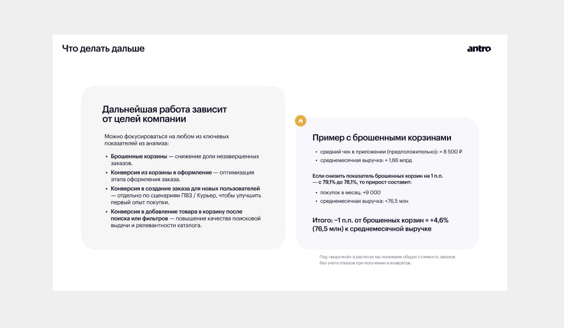 Мы детально разбираем воронку, выявляем точки потерь, анализируем поведение пользователей и формируем гипотезы для роста конверсии и выручки.