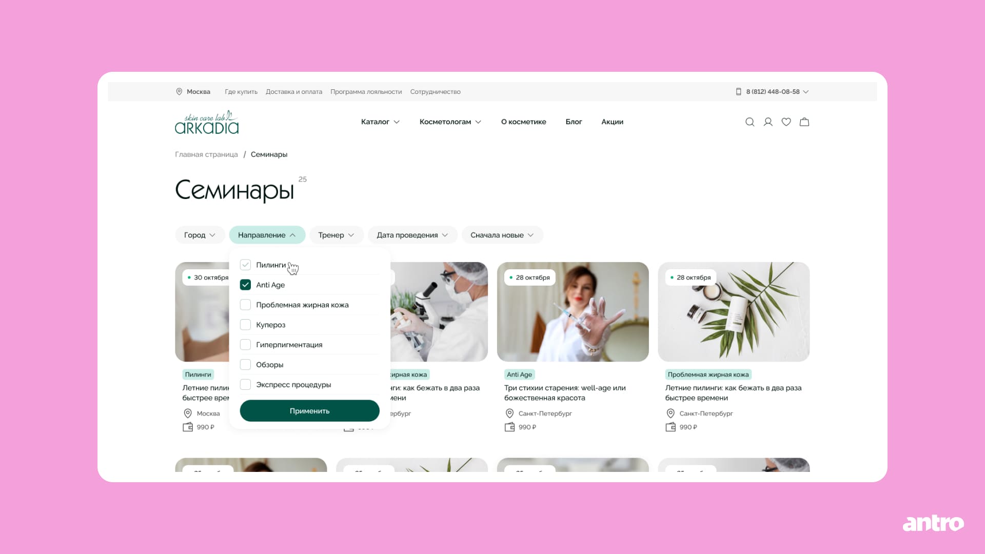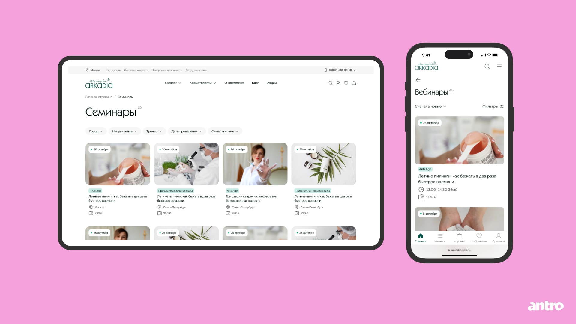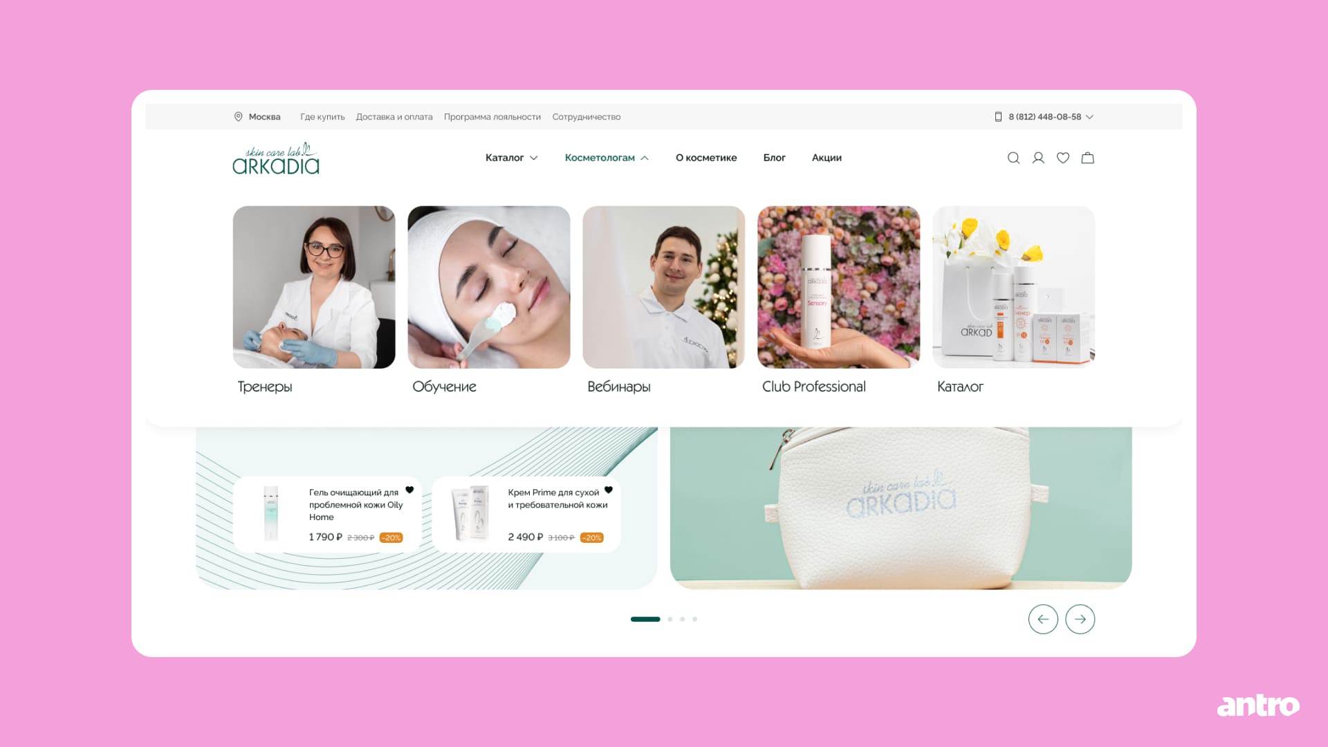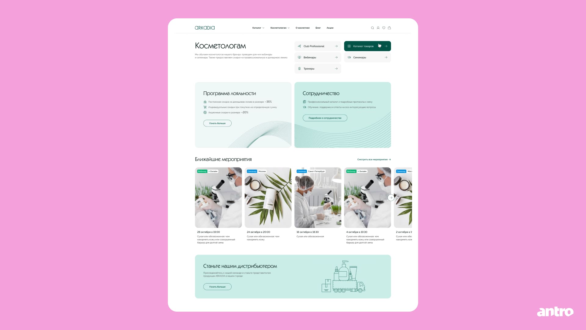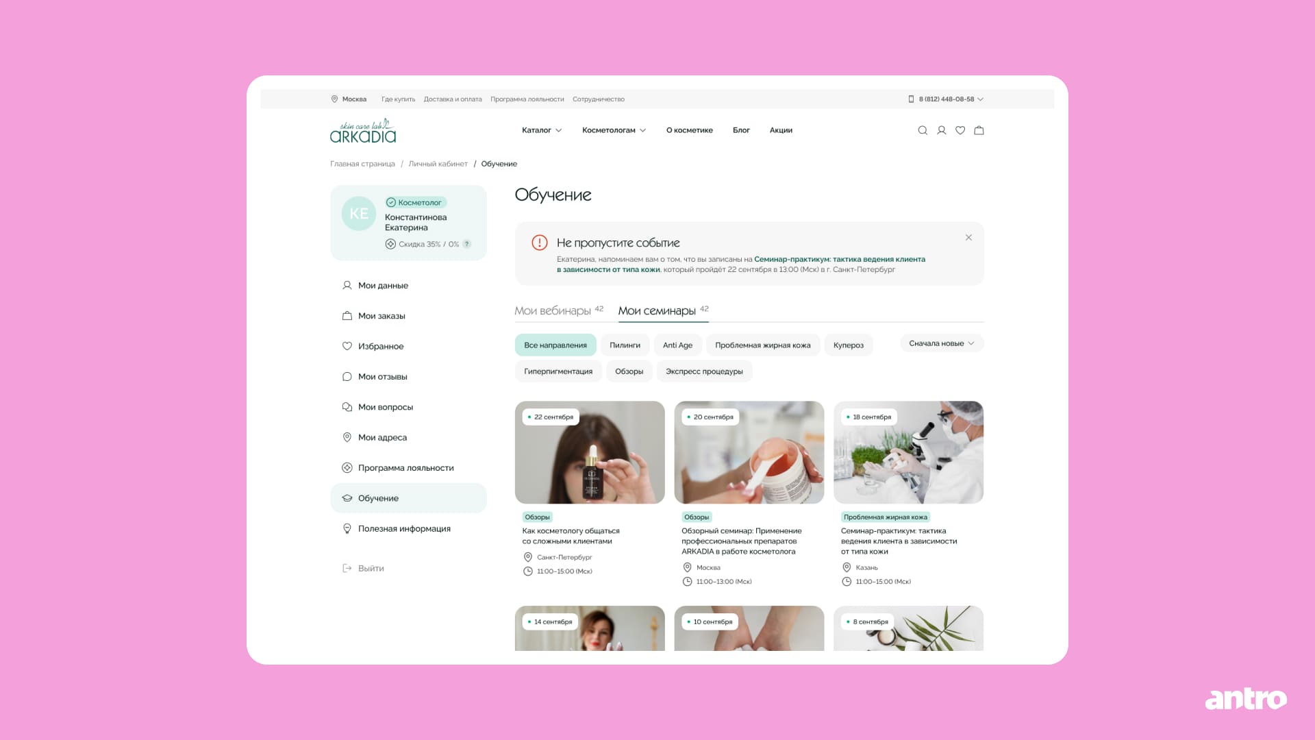 Для косметологов добавили разделы с обучением и полезными материалами по продукции ARKADIA.