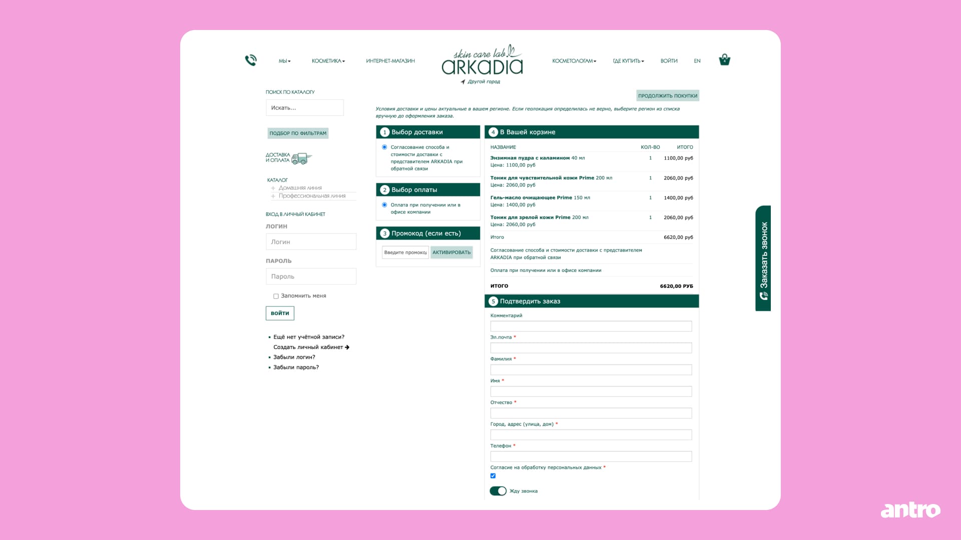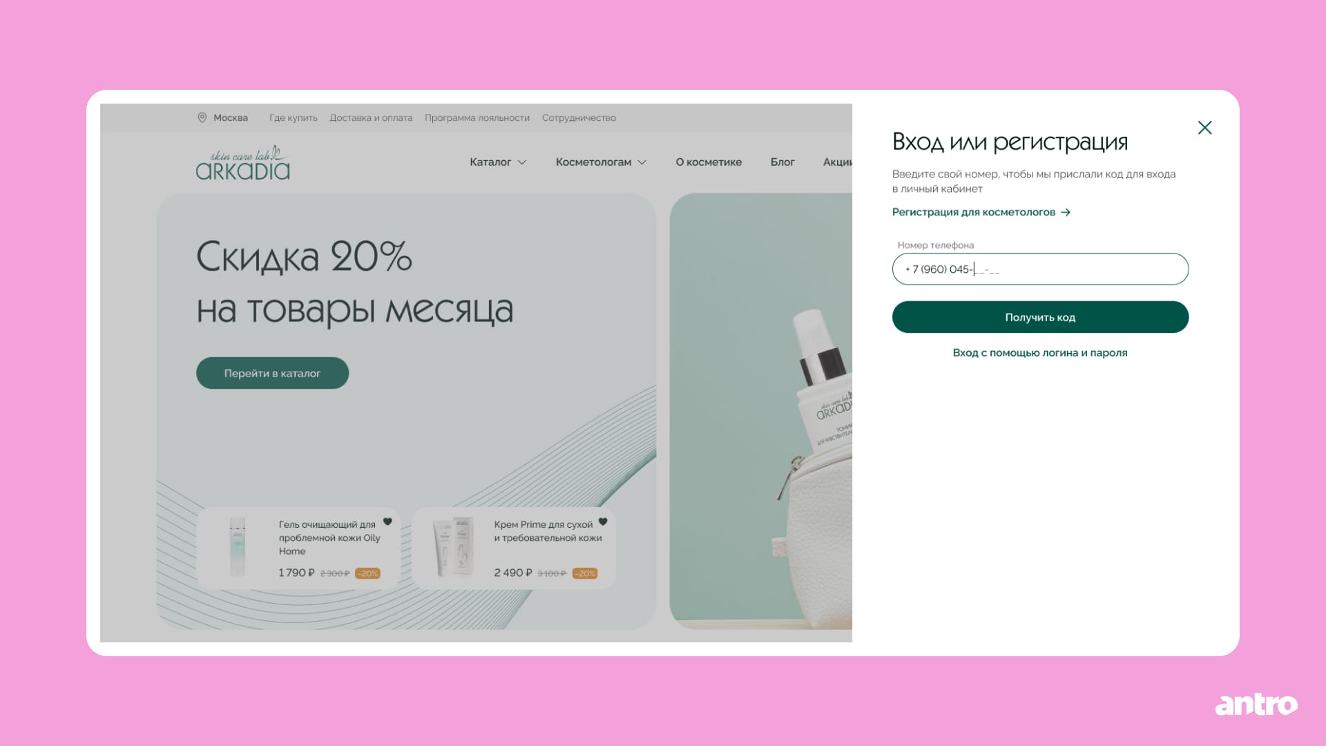Для покупателей предусмотрена быстрая регистрация по номеру телефона. Для косметологов — подтверждение профессионального статуса. При этом если специалист зарегистрировался как обычный пользователь, он может подтвердить статус позже, в личном кабинете.