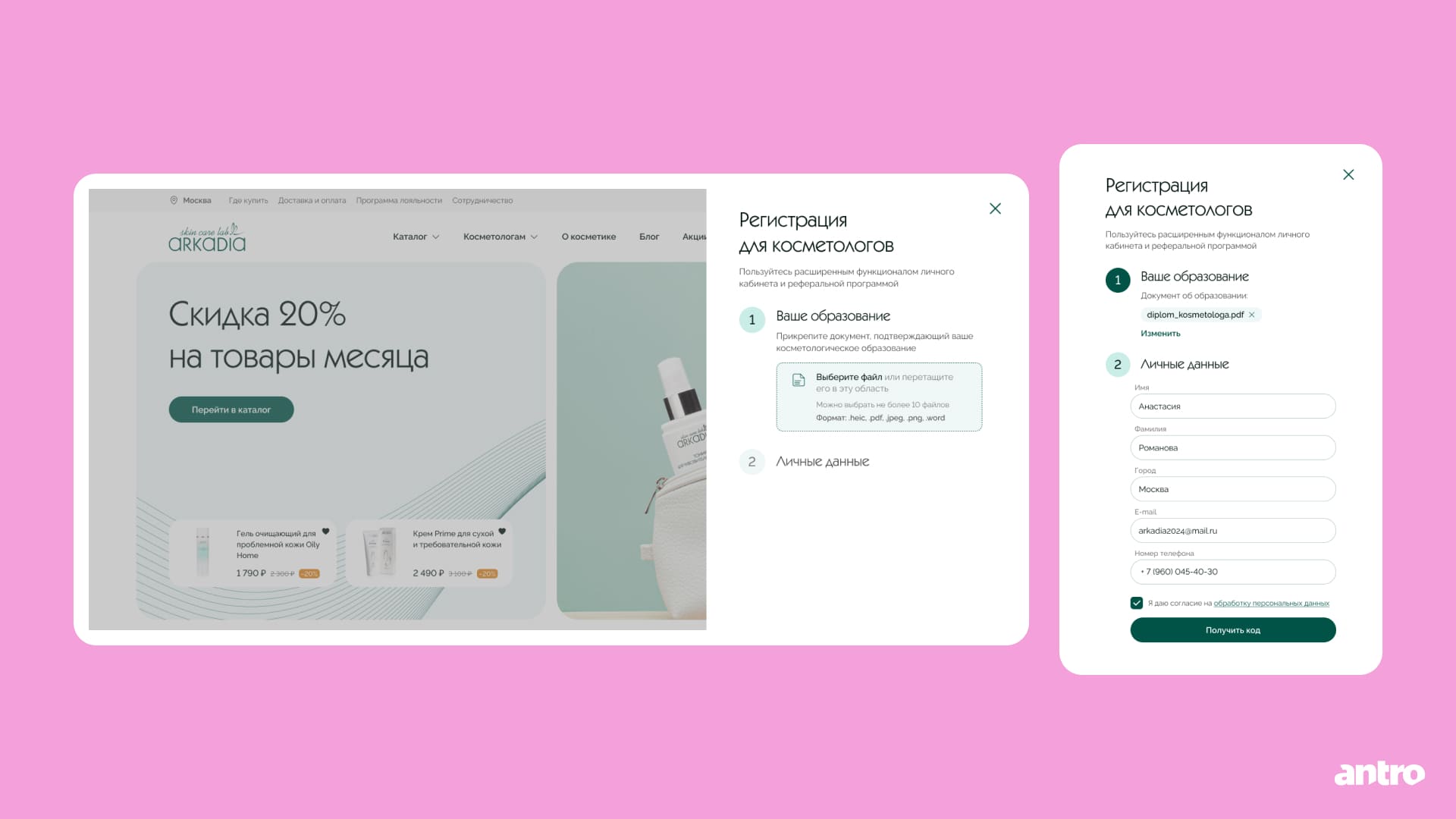 Регистрацию для косметологов разбили на два шага — «Образование» и «Личные данные»: на первом этапе пользователь загружает подтверждающий документ, поэтому требования понятны сразу и не становятся сюрпризом в конце.