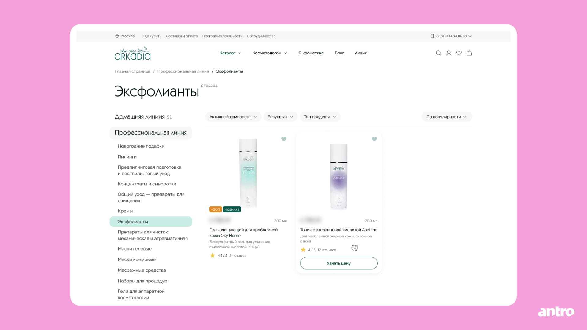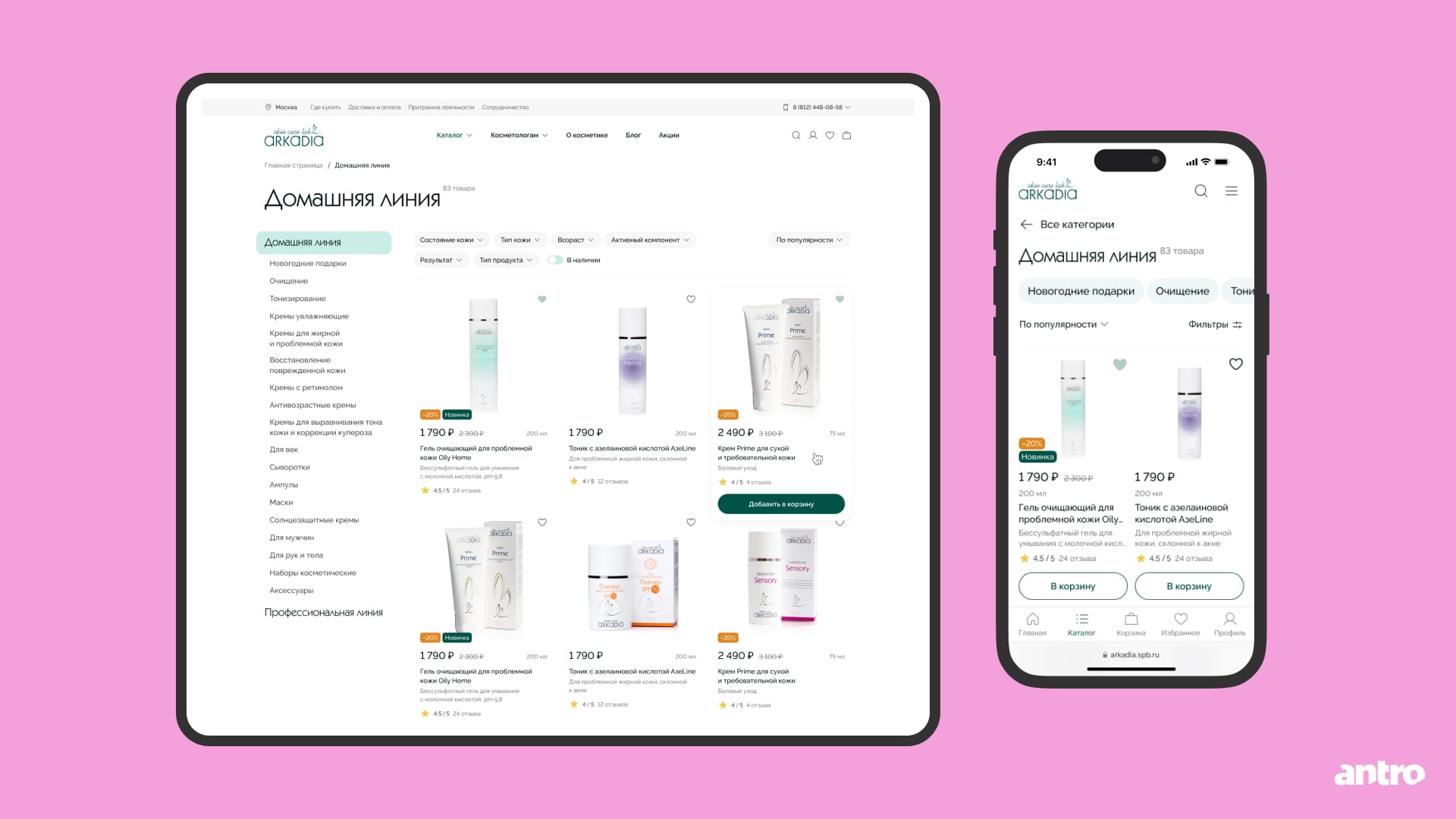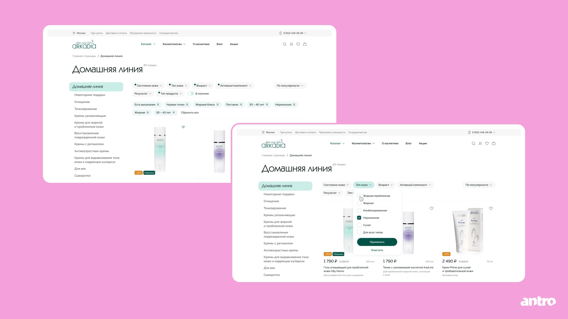 Спроектировали единый интерфейс для двух аудиторий — покупателей и косметологов. И аккуратно разделили сценарии доступа к профессиональной линии, не ломая общий пользовательский путь.