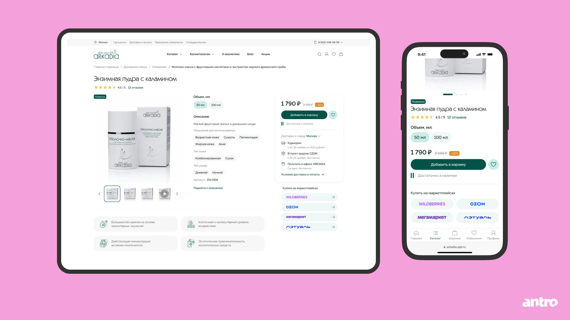 На первом экране собрали ключевую информацию: фотографии, описание и цену. В buy-блоке показали условия доставки с учётом выбранного города. Поскольку продукцию можно приобрести не только на сайте, но и на маркетплейсах, важно было сделать этот блок понятным и не перегруженным.