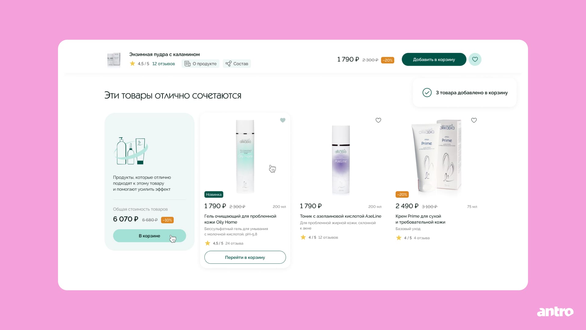 Добавили рекомендации сопутствующих товаров с возможностью добавить комплект в корзину одним действием.