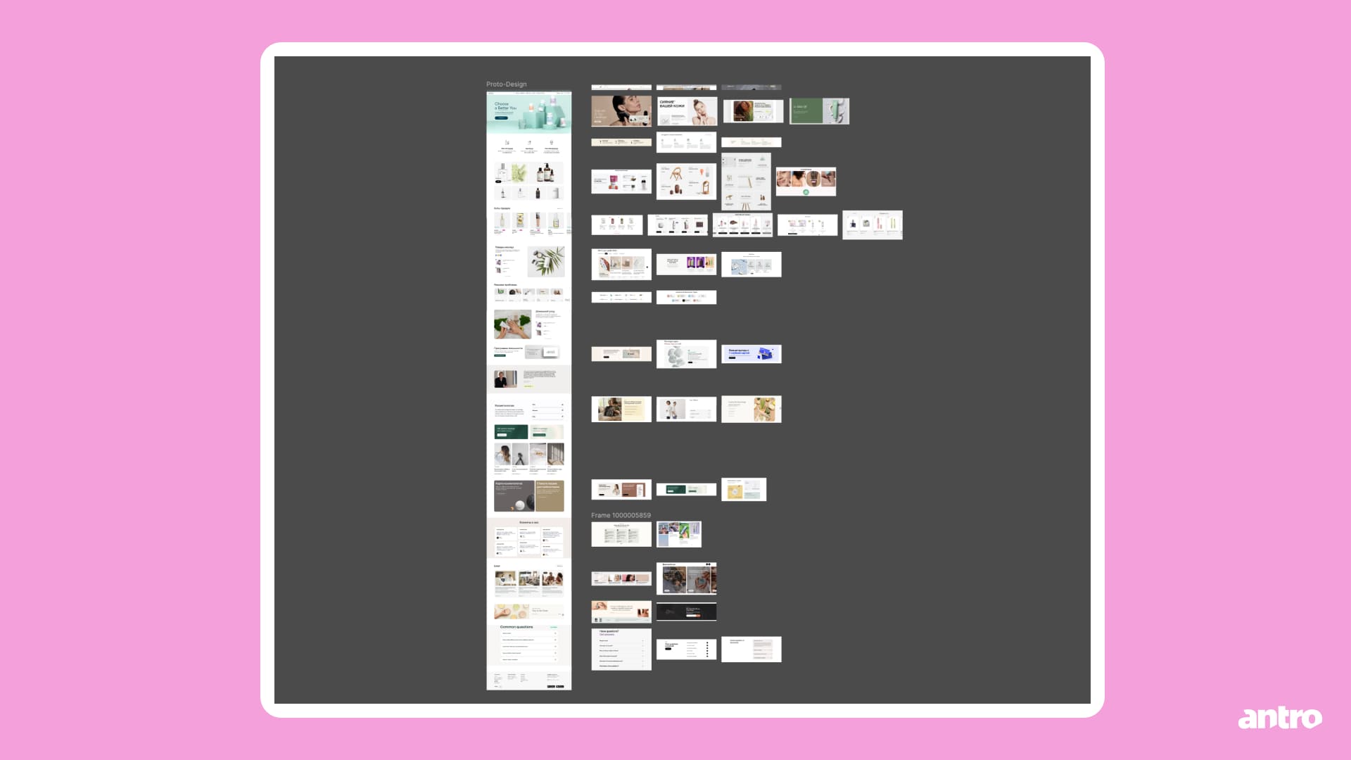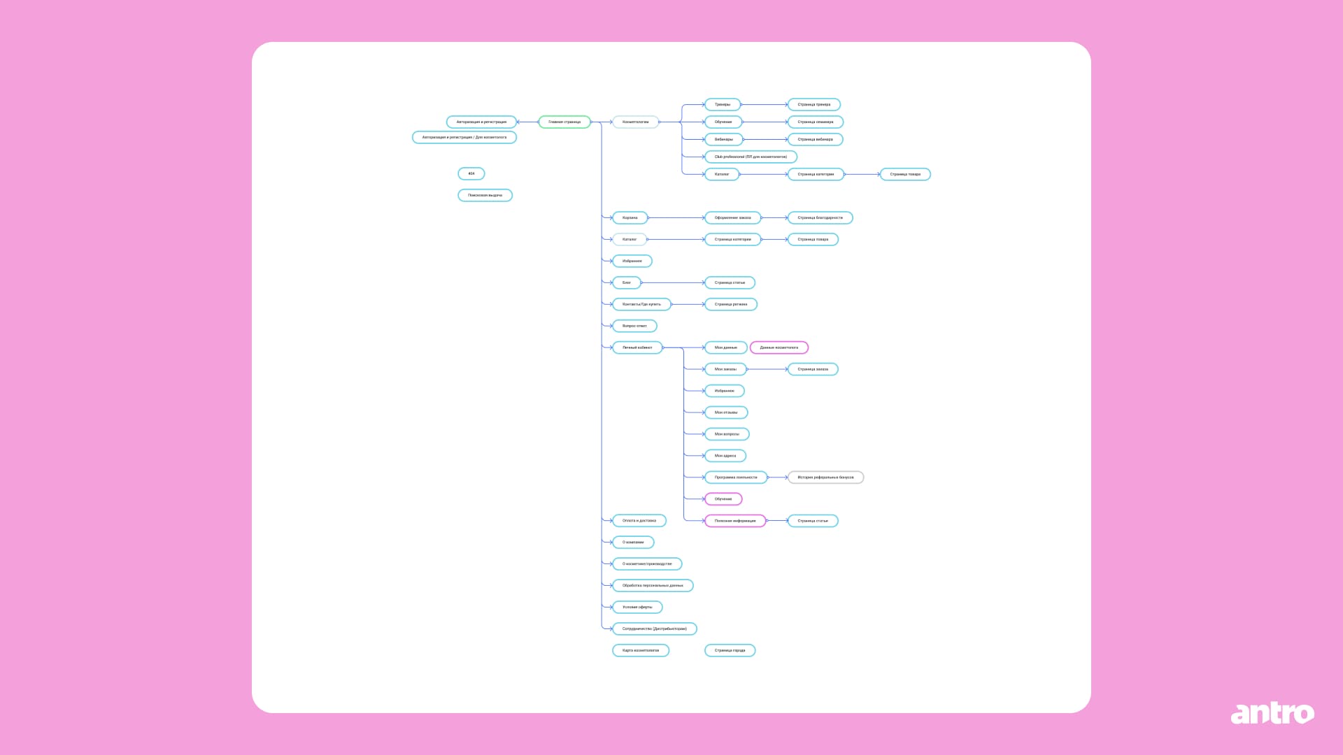Работу начали с карты сайта: она помогла зафиксировать структуру и продумать, как в рамках одного интерфейса разделить два сегмента — розничных покупателей и профессиональных косметологов.