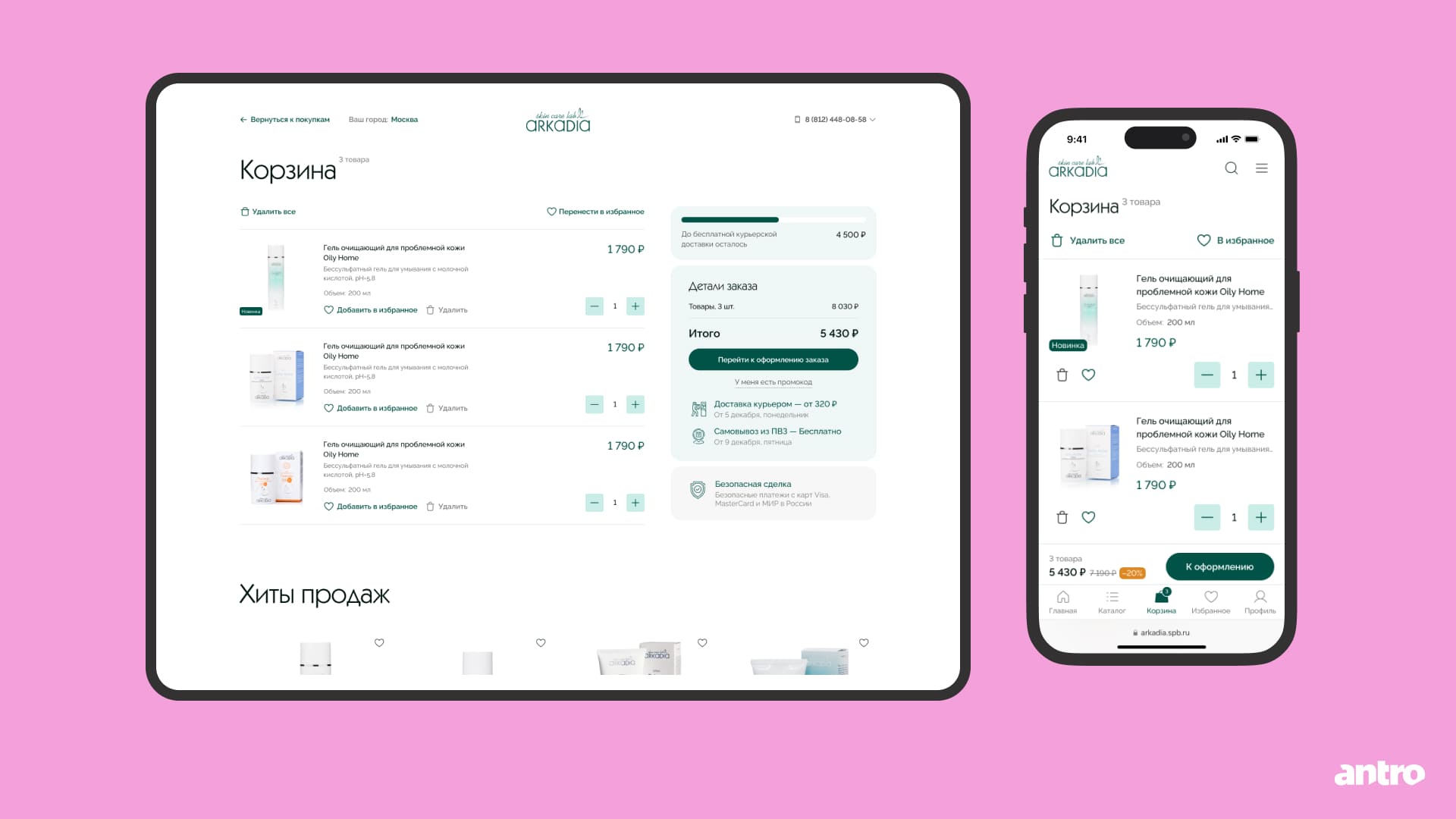 Корзину построили по привычной логике и добавили полезные элементы: например, отсчёт до бесплатной курьерской доставки и блок с допродажами.