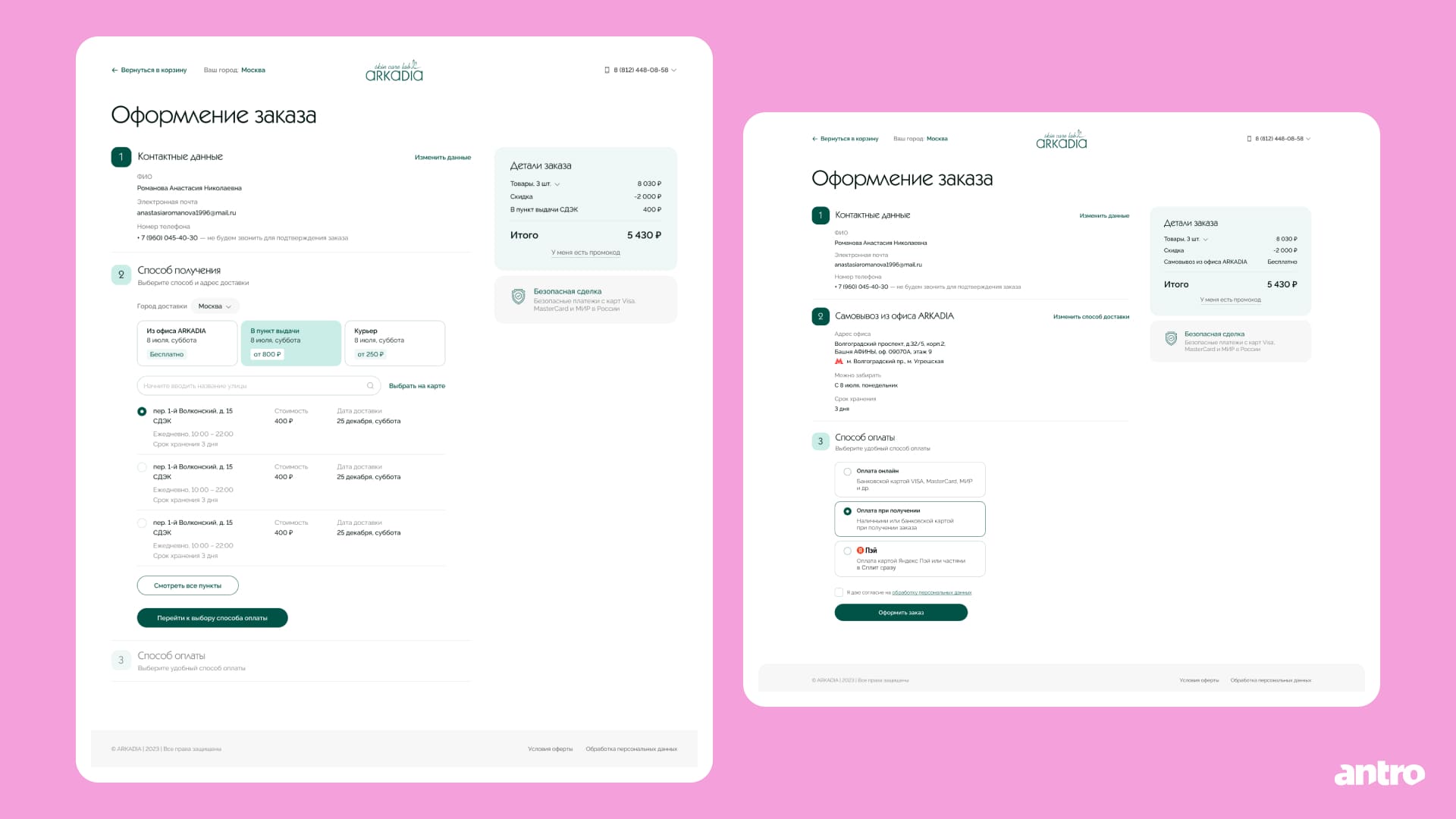 Оформление заказа сделали пошаговым. Три последовательных этапа помогают пользователю понимать прогресс и снижают тревожность перед подтверждением заказа.