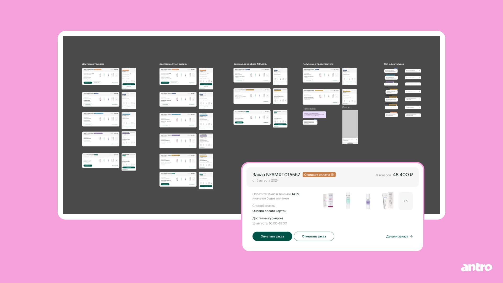 Пользователь может управлять данными, отслеживать заказы и их статусы; систему статусов детально проработали с учётом разных способов доставки, чтобы ожидание было максимально прозрачным.