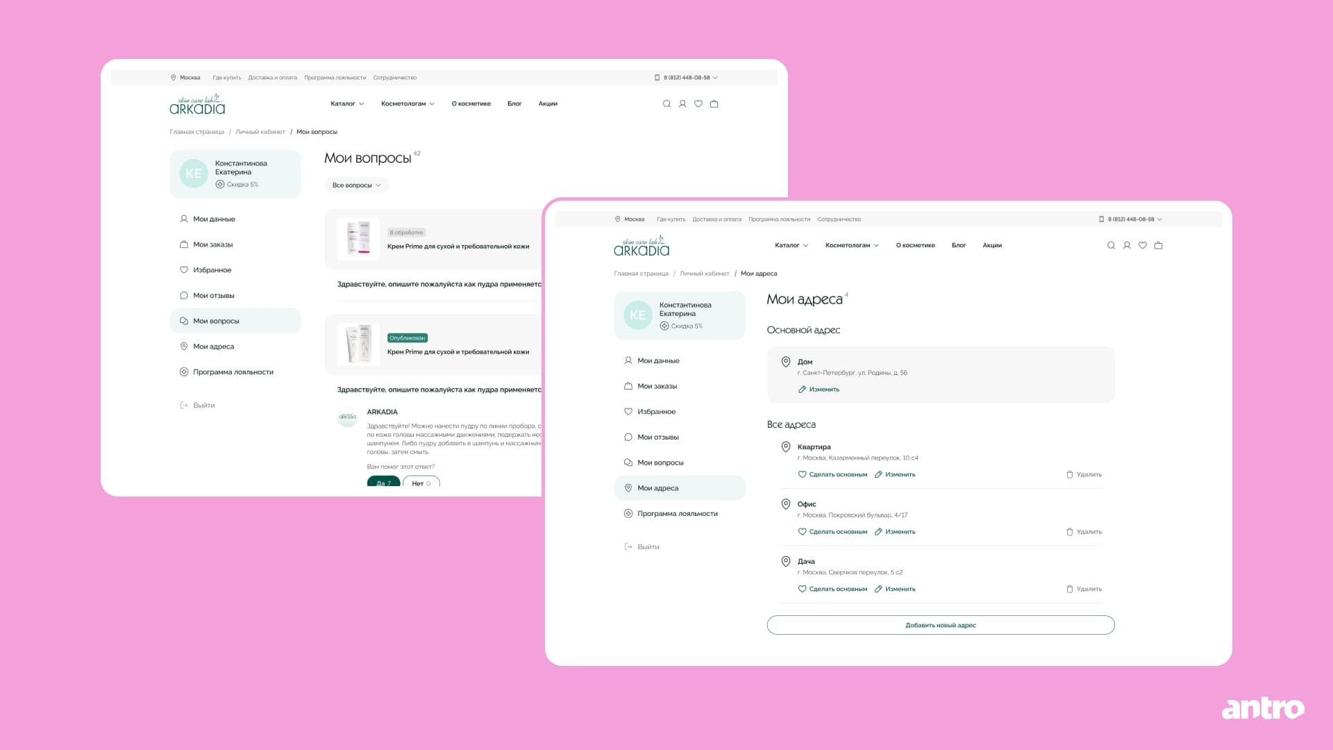 Собрали в одном месте пользовательскую активность: отзывы и вопросы по товарам — не нужно заново искать продукты в каталоге. Добавили сохранение адресов доставки, чтобы ускорить повторные покупки.