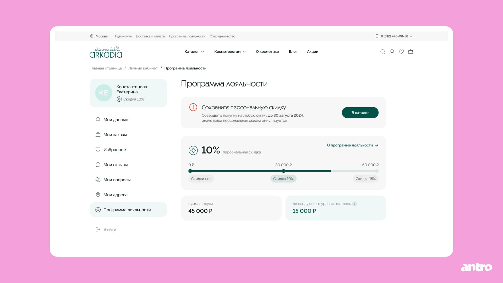 Отдельно проработали программу лояльности — одну из самых сложных частей кабинета. Так как условия различаются для покупателей и косметологов, сделали их максимально наглядными: текущий уровень, сумма выкупа и прогресс до следующего уровня визуализированы в интерфейсе, а прогресс‑бар добавляет лёгкий элемент геймификации.