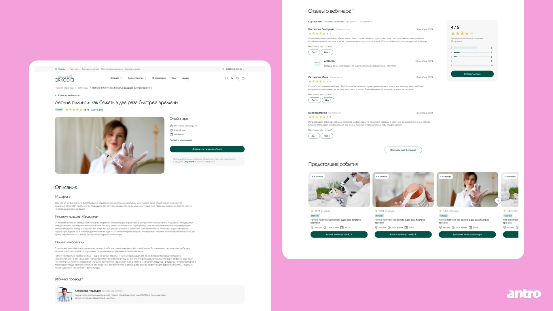 Для каждого вебинара и семинара спроектировали страницу с полной информацией и возможностью оставлять отзывы. Это помогает формировать профессиональное сообщества вокруг бренда.