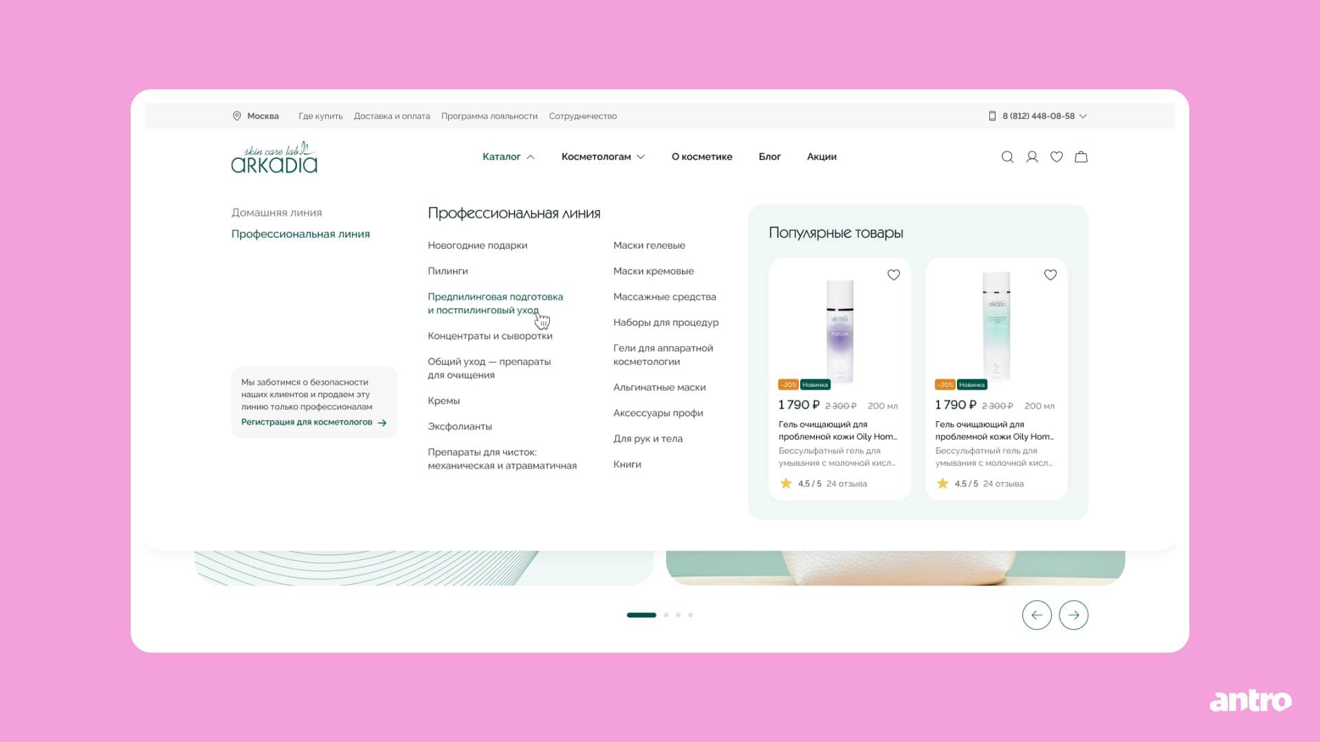 Раздел «Косметологам» собрали как единый хаб для профессиональной аудитории: меню ведёт в профильные разделы и в каталог профессиональной линии. Так информация для косметологов не утяжеляет хедер и остаётся логично сгруппированной.