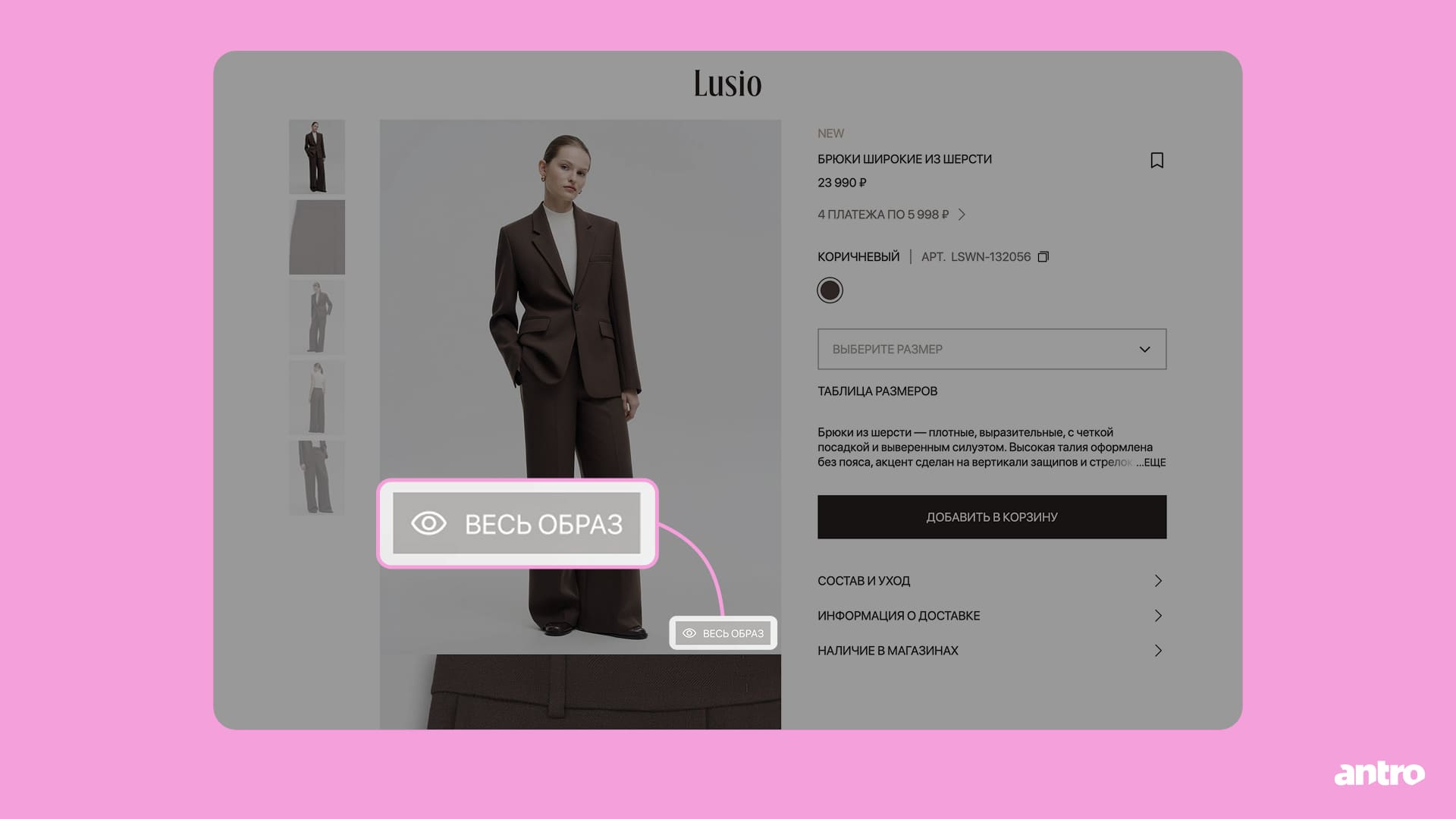 На первой фотографии расположена кнопка «Весь образ», которая позволяет увидеть все вещи, надетые на модели.