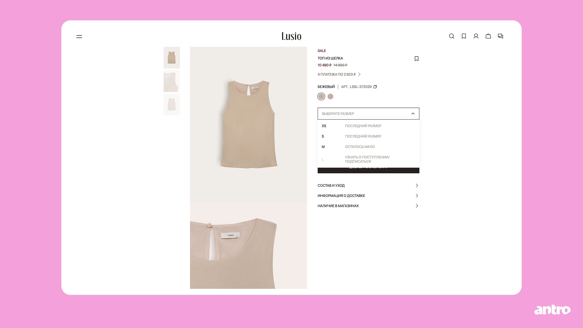 При выборе размера пользователь сразу видит, есть ли он в наличии. Метки «Последний размер» и «Осталось мало» стимулируют к покупке, а при отсутствии товара доступна подписка на уведомления о поступлении.