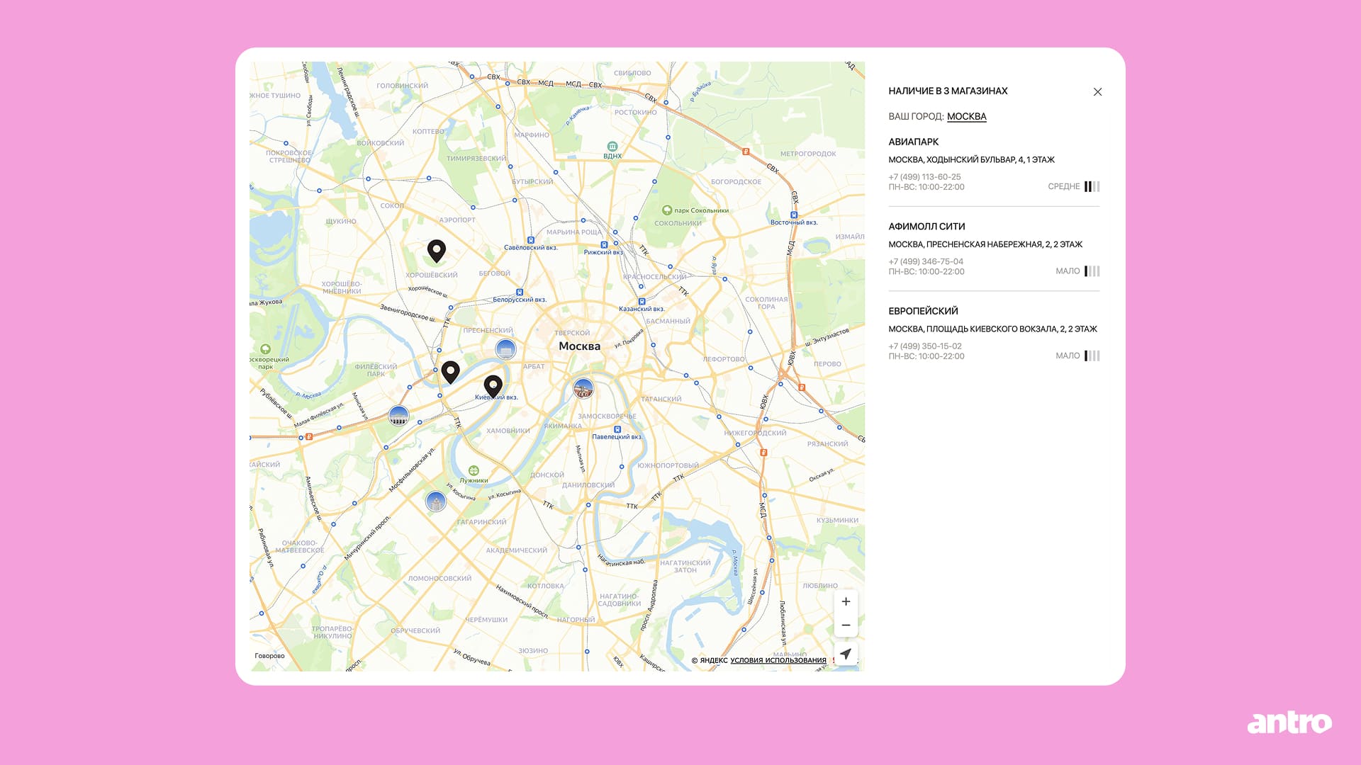 Можно узнать информацию о наличии в магазинах — в шторке будет карта с магазинами и контакты для связи.