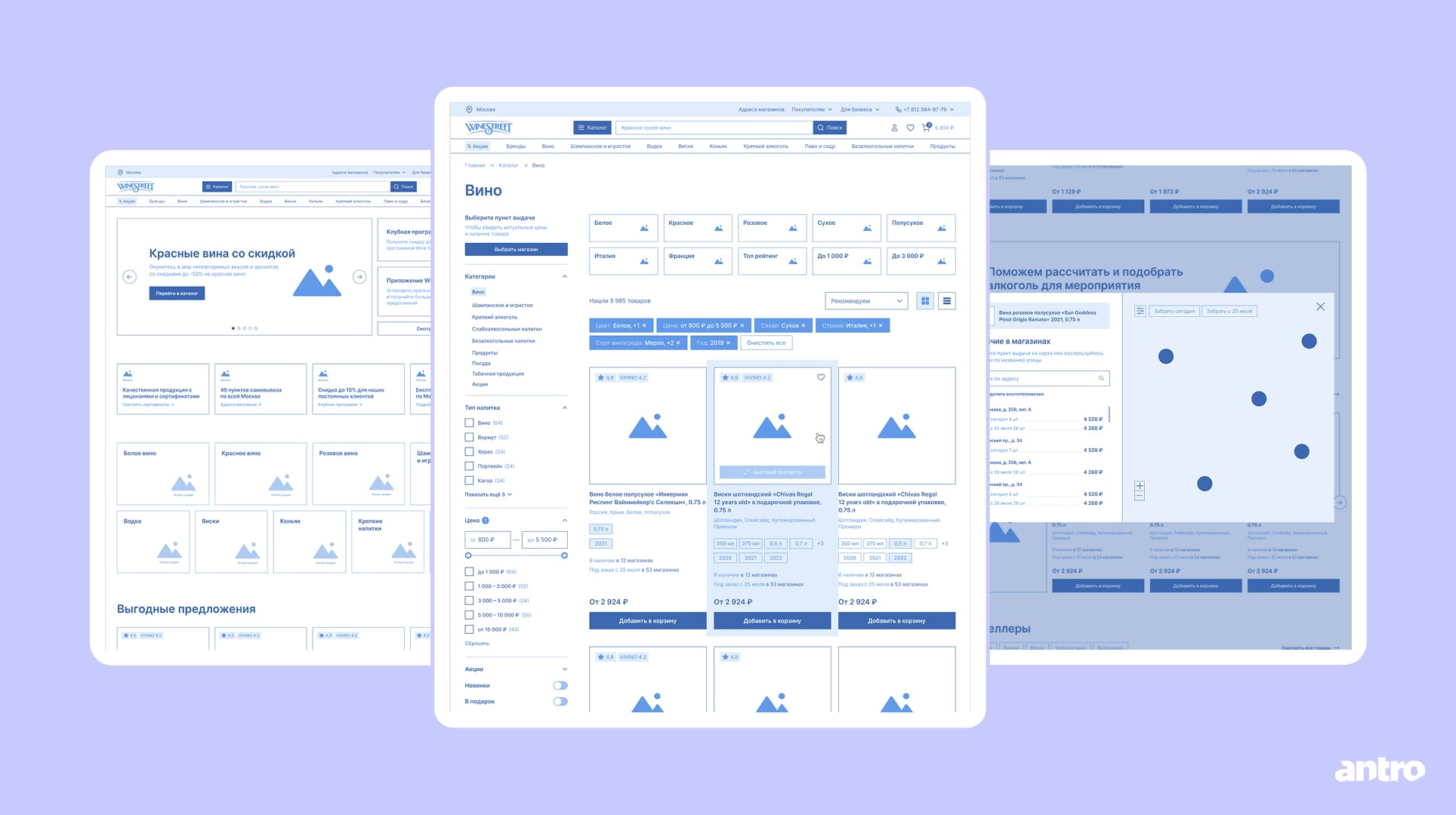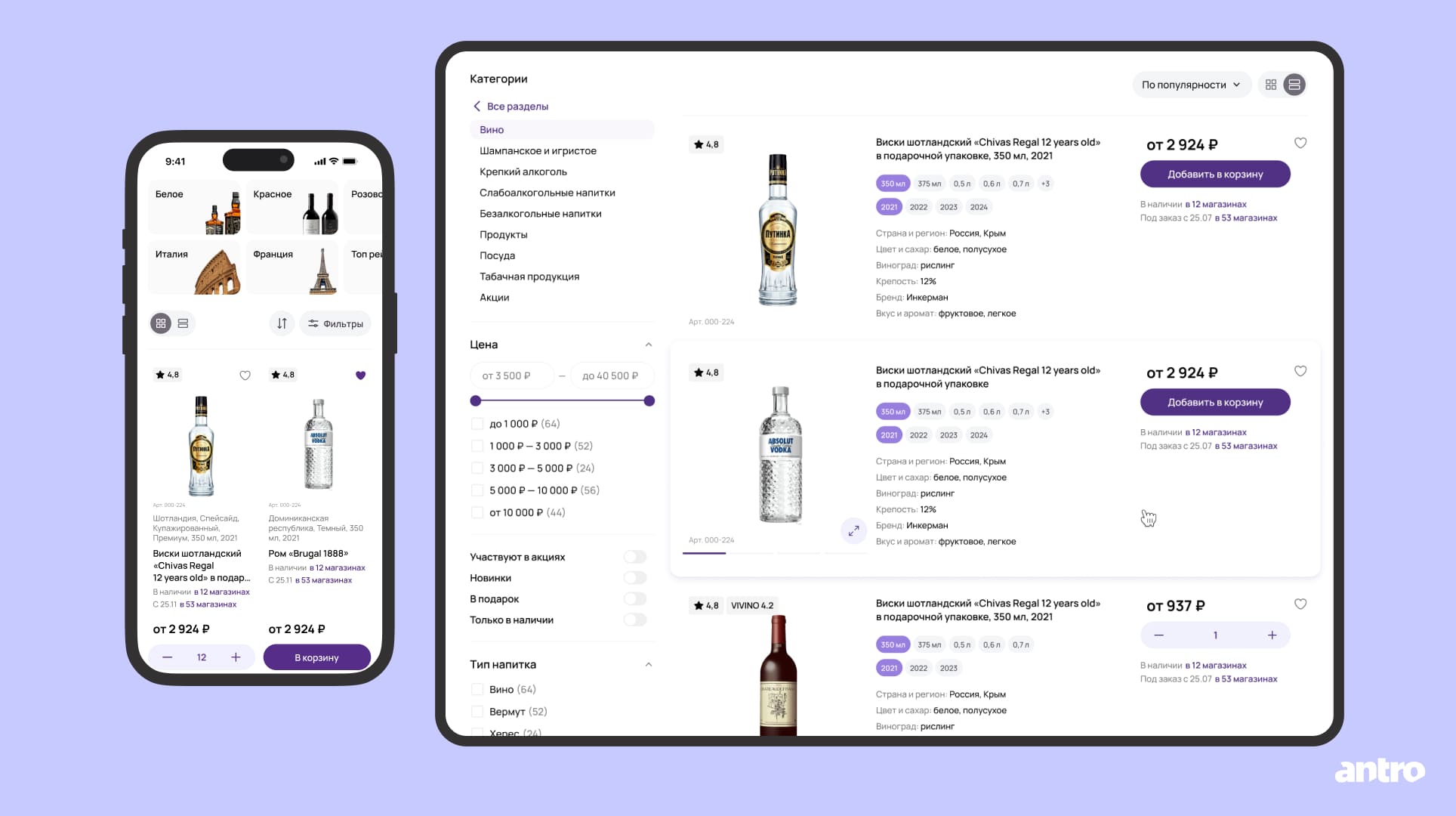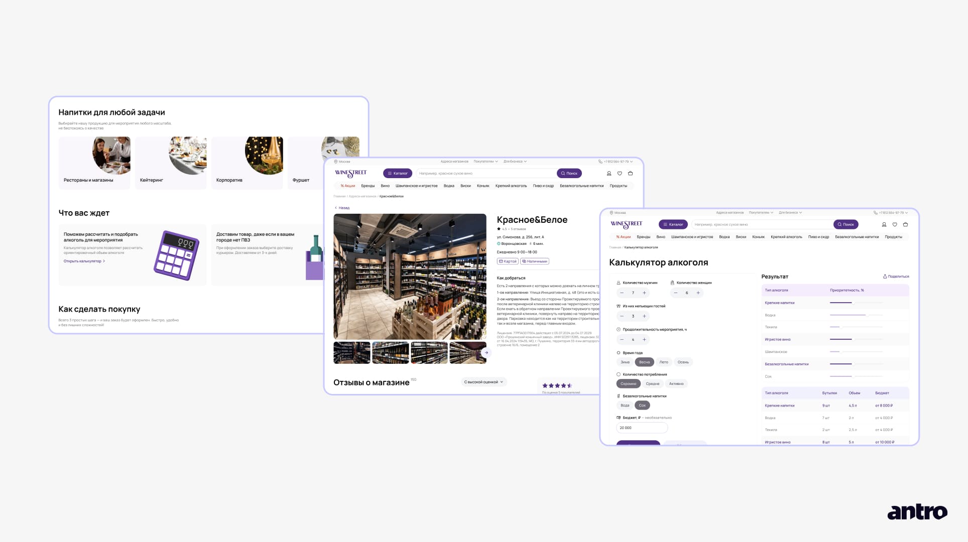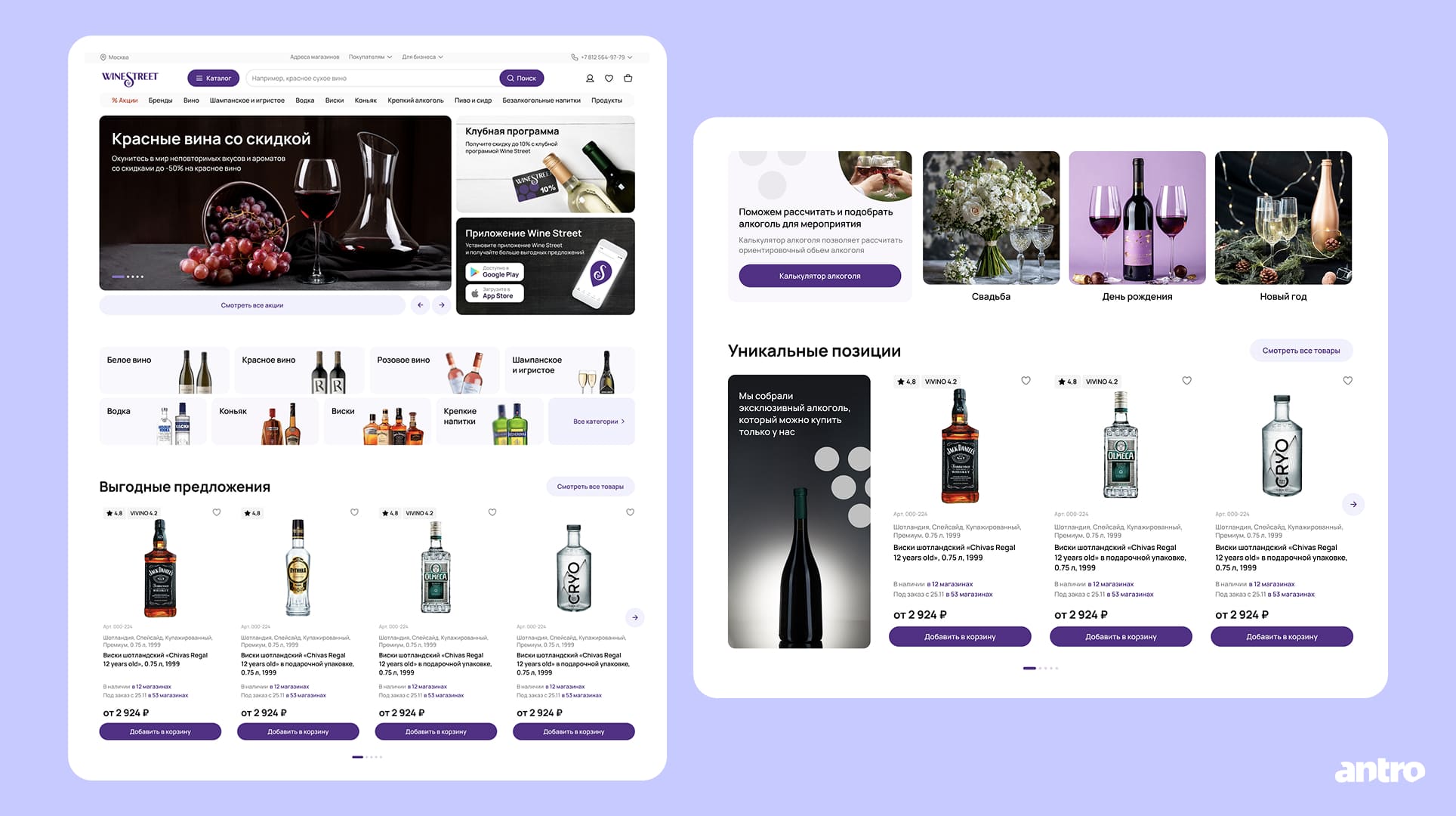 Важно было показать широту ассортимента и наличие редких позиций. Для навигации по большому каталогу вынесли готовые подборки, калькулятор алкоголя и полезные материалы в блоге.