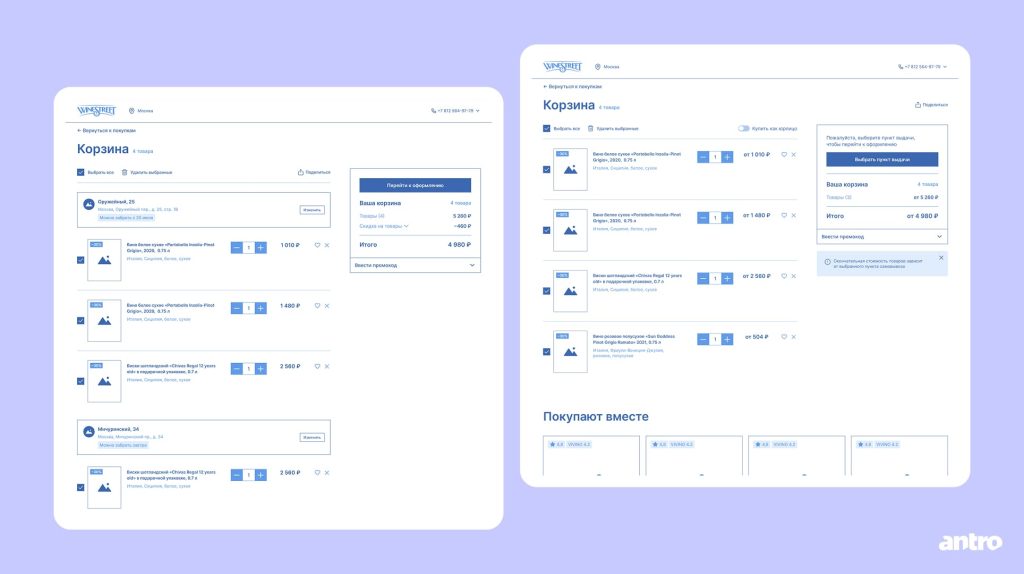 Отдельным испытанием стало проектирование корзины и оформления заказа. Нужно было учесть сценарии, когда в корзине оказываются товары с разными сроками получения и из разных ПВЗ. Мы проработали несколько вариантов составной корзины, но в итоге приняли решение упростить процесс и отказаться от объединения разных ПВЗ и способов получения в одном заказе.
