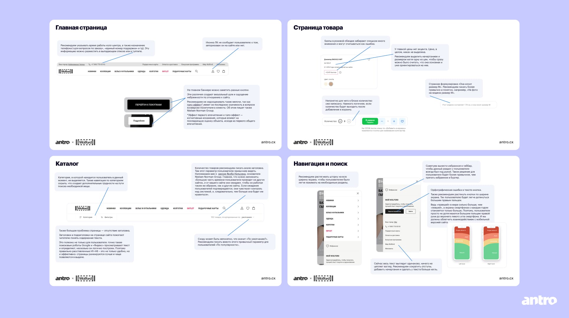 Мы начали с юзабилити-аудита ключевых точек: главная, навигация, поиск, каталог, страница товара, авторизация, личный кабинет и информационные разделы. Проверяли десктоп и мобильную версию, делая упор на мобайле.