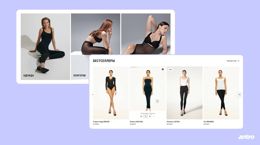 Добавили блоки с категориями, коллекциями и новинками, чтобы показать ассортимент, ценовую политику, изделия и визуальный образ бренда.