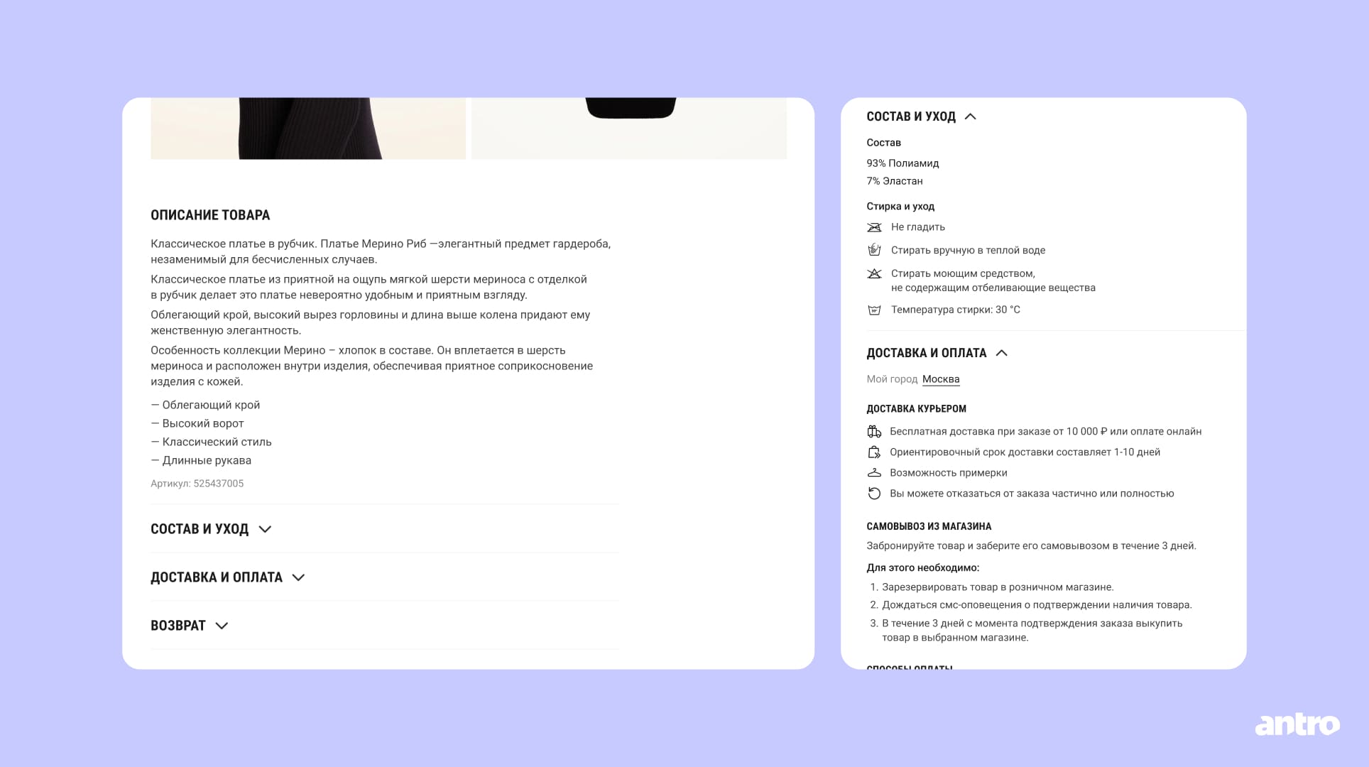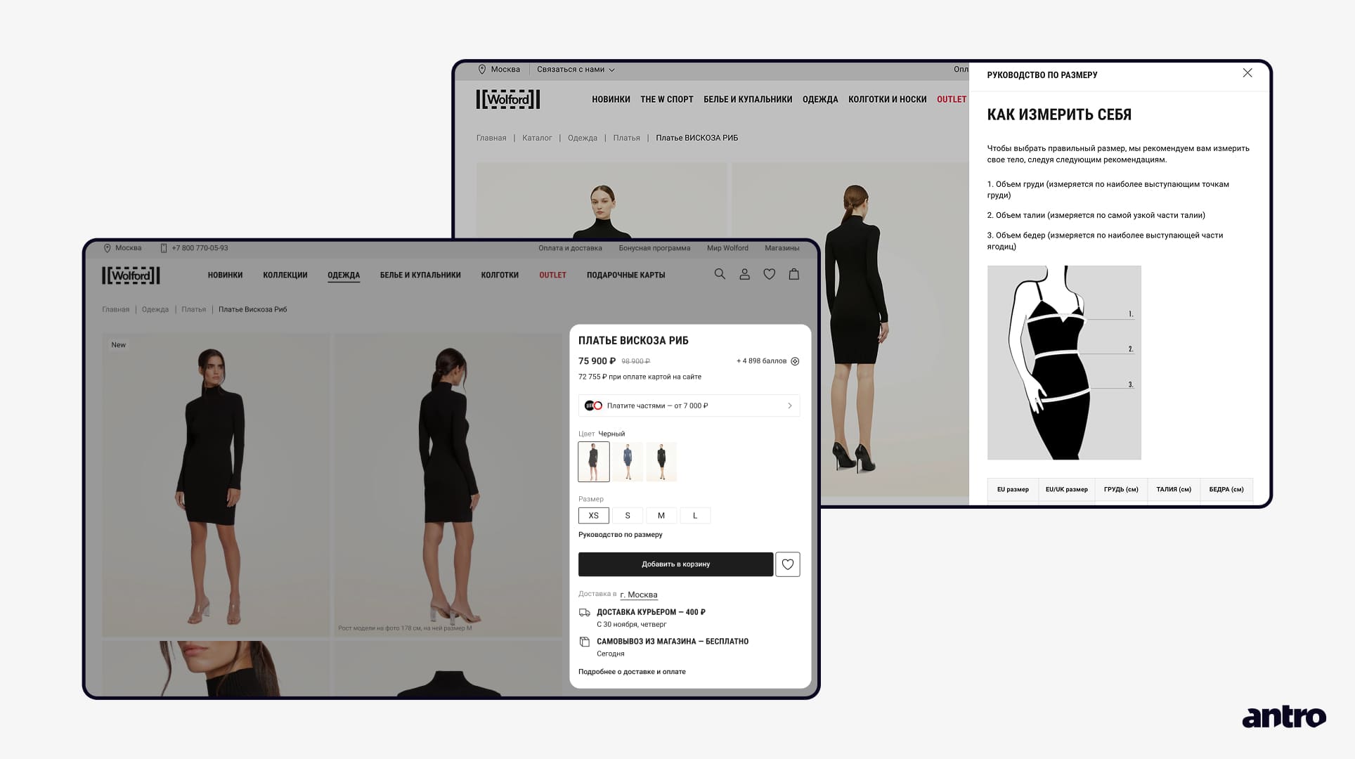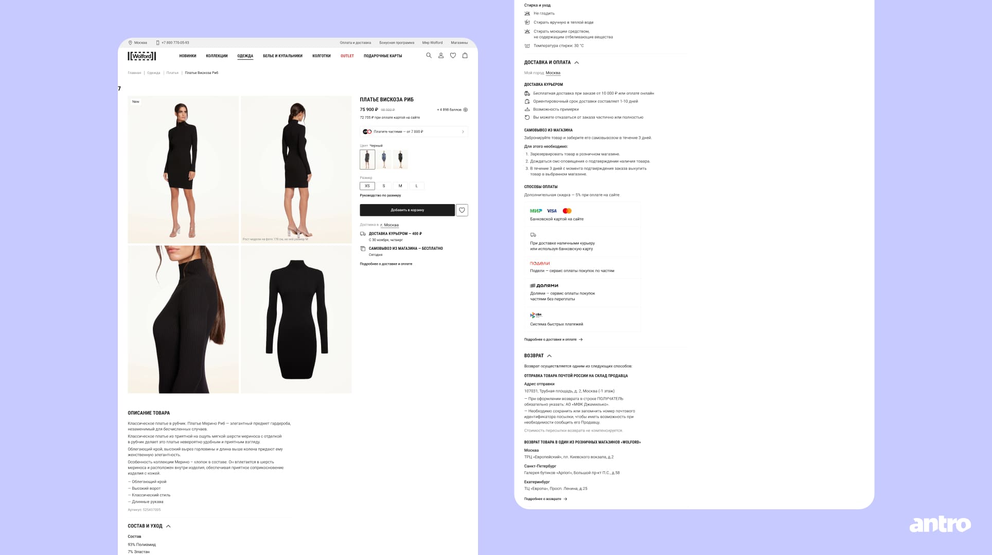 Рядом с ценой и кнопкой покупки добавили информацию о BNPL (покупка в рассрочку), чтобы пользователь сразу видел доступные варианты оплаты. В этом же блоке показали способы, сроки и стоимость доставки. А еще добавили понятное руководство по размерам с измерениями и подсказками по выбору.